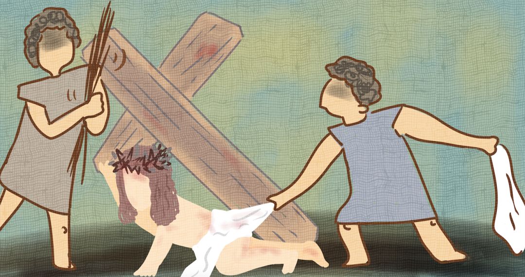 耶稣背起十架(约翰福音19章12-16节);(马可福音15章17-20节)