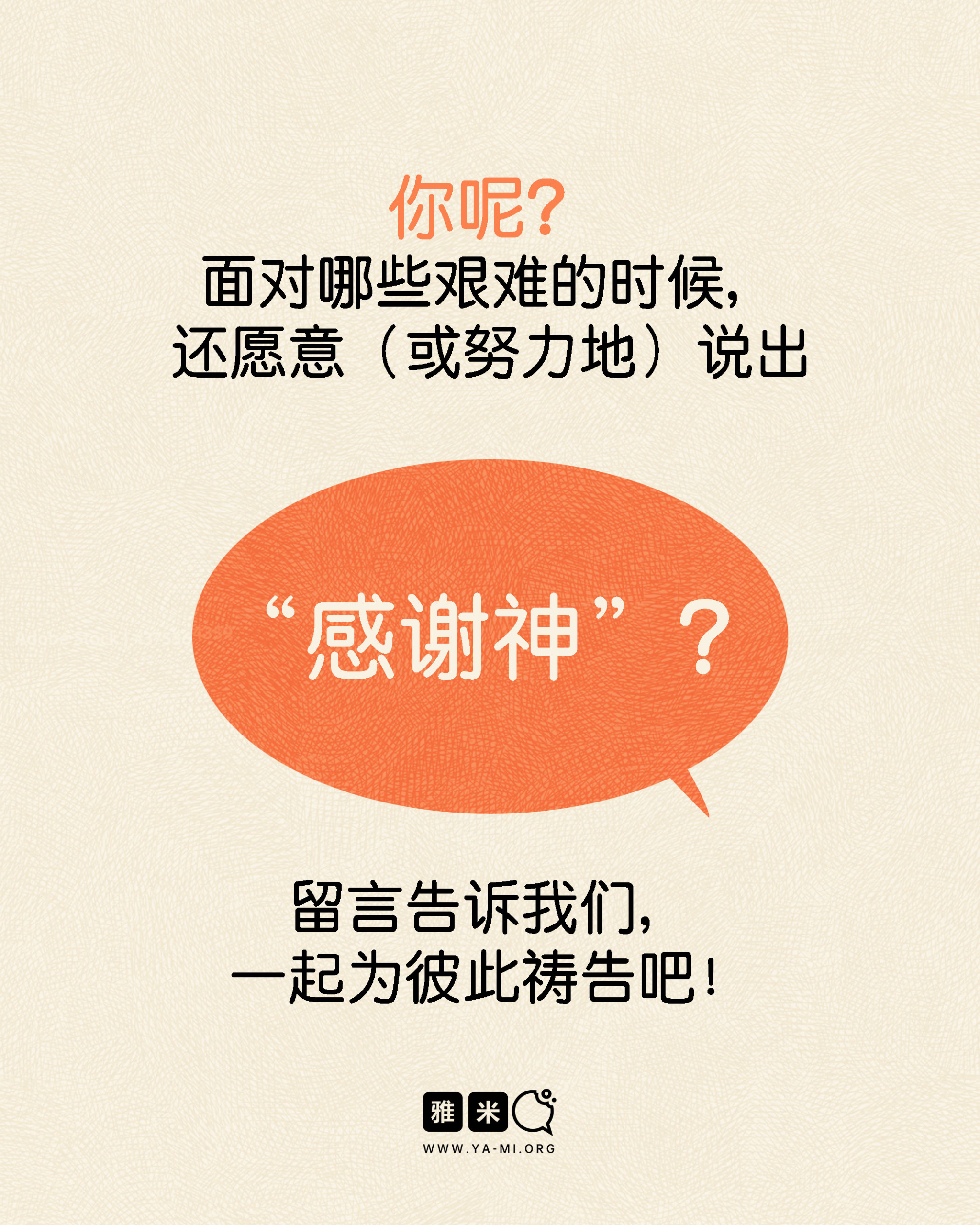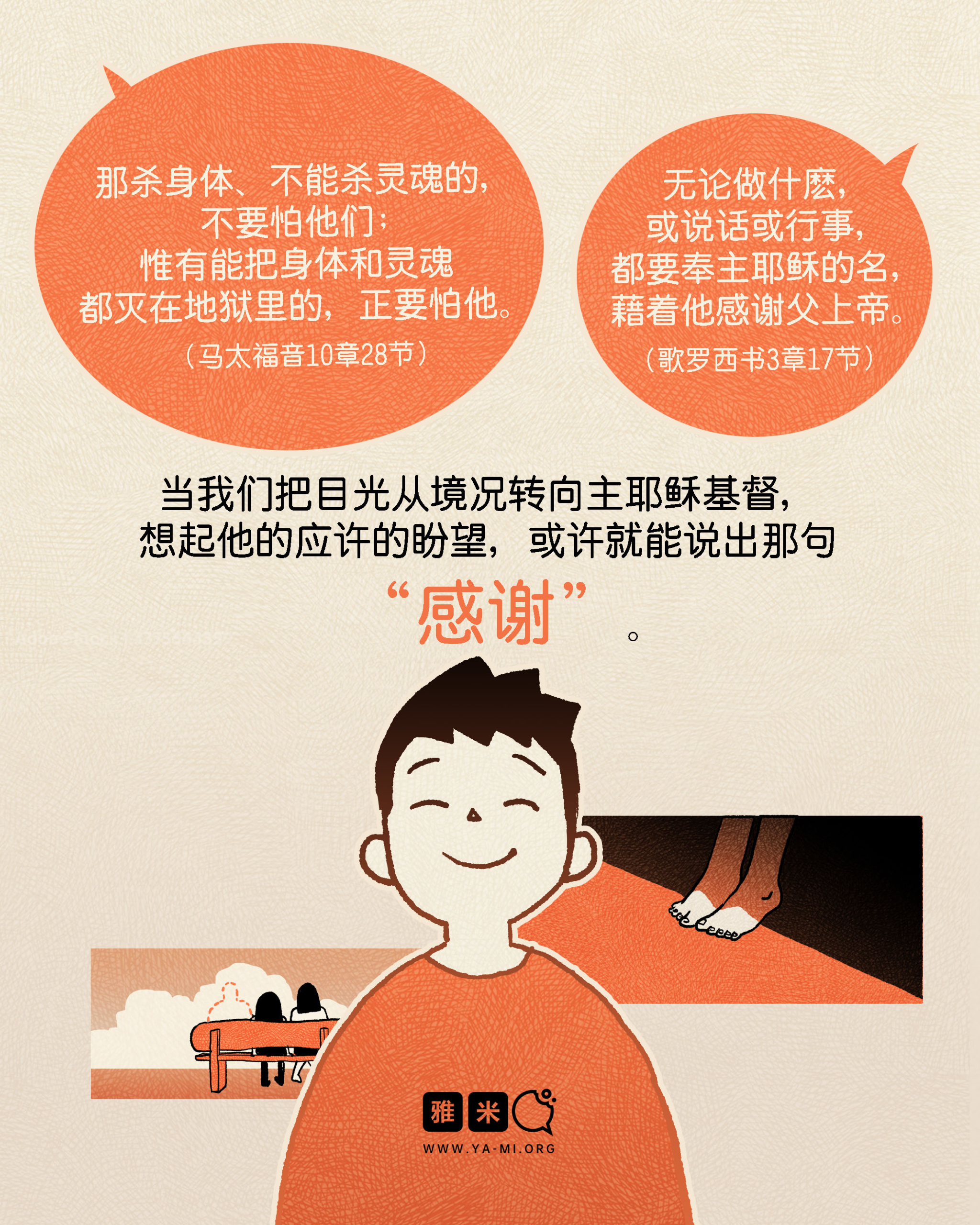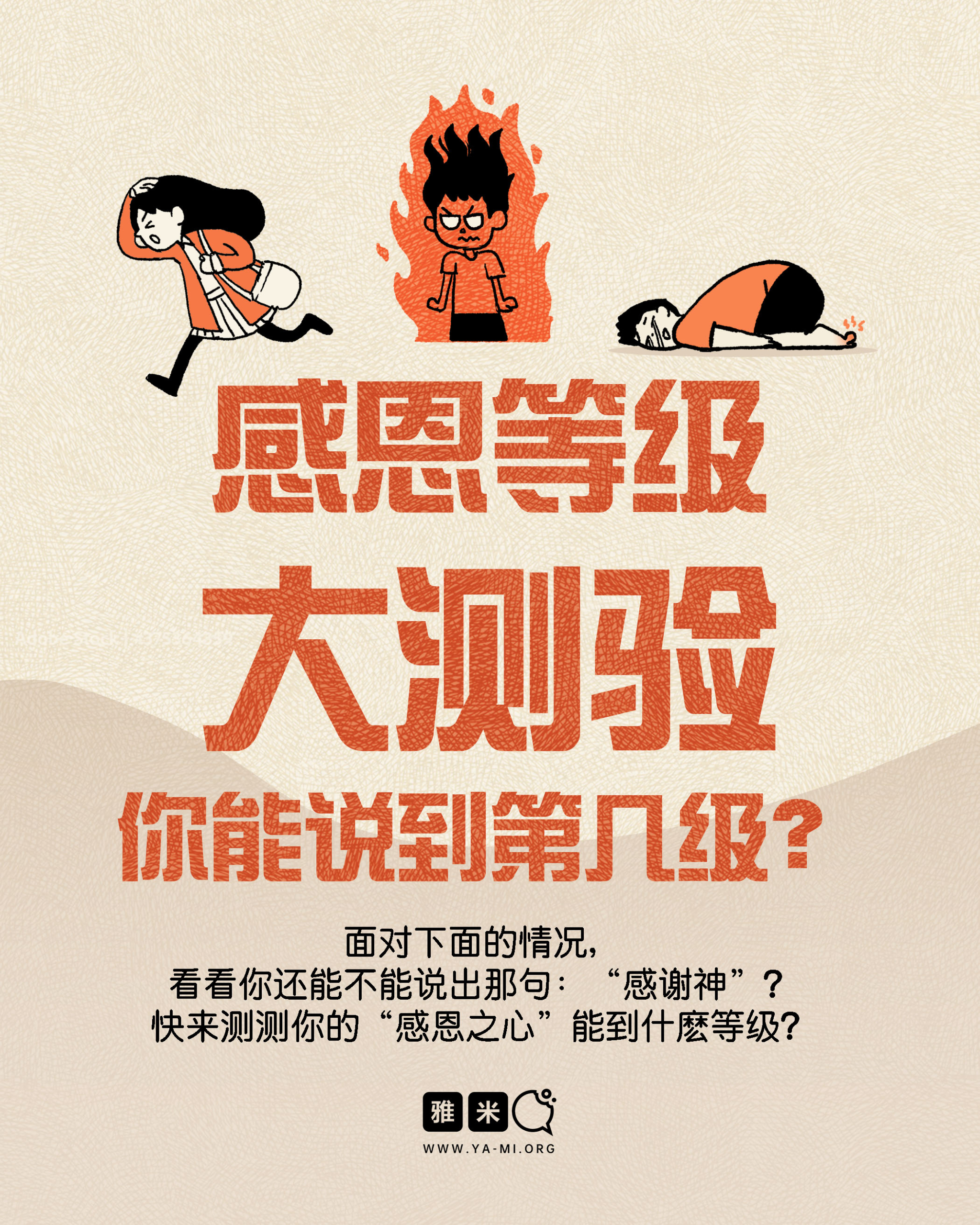 11月图文特辑:感恩等级大测验——你能说到第几级?2025 年 11 月 12 日/0 评论/在: 图文特辑, 艺术空间/通过: 雅米 绘画:Chin“感谢神”应该可以算是基督徒最常听见/最常说的“口头禅”了吧? 顺境的时候、被神祝福的时候,感到平安喜乐的时候,我们很自然就会感谢神。然而,当你面对不太好的情况时,你还能说出这句感谢吗?快來测测你的“感恩”等级,希望你感觉有趣的同时,也能被提醒感恩的意义! *此文章由雅米事工原创,如需转载,请注明出自“雅米,祢的话语so yummy!- www.ya-mi.org”分享此条目! https://ya-mi.org/sc/wp-content/uploads/2025/11/感恩等级大测验_feature-Image_SC.jpg 860 2048 雅米 https://ya-mi.org/tc/wp-content/uploads/2025/05/%E6%96%B0logo.jpeg 雅米2025-11-12 07:01:002025-11-11 23:15:2011月图文特辑:感恩等级大测验——你能说到第几级?