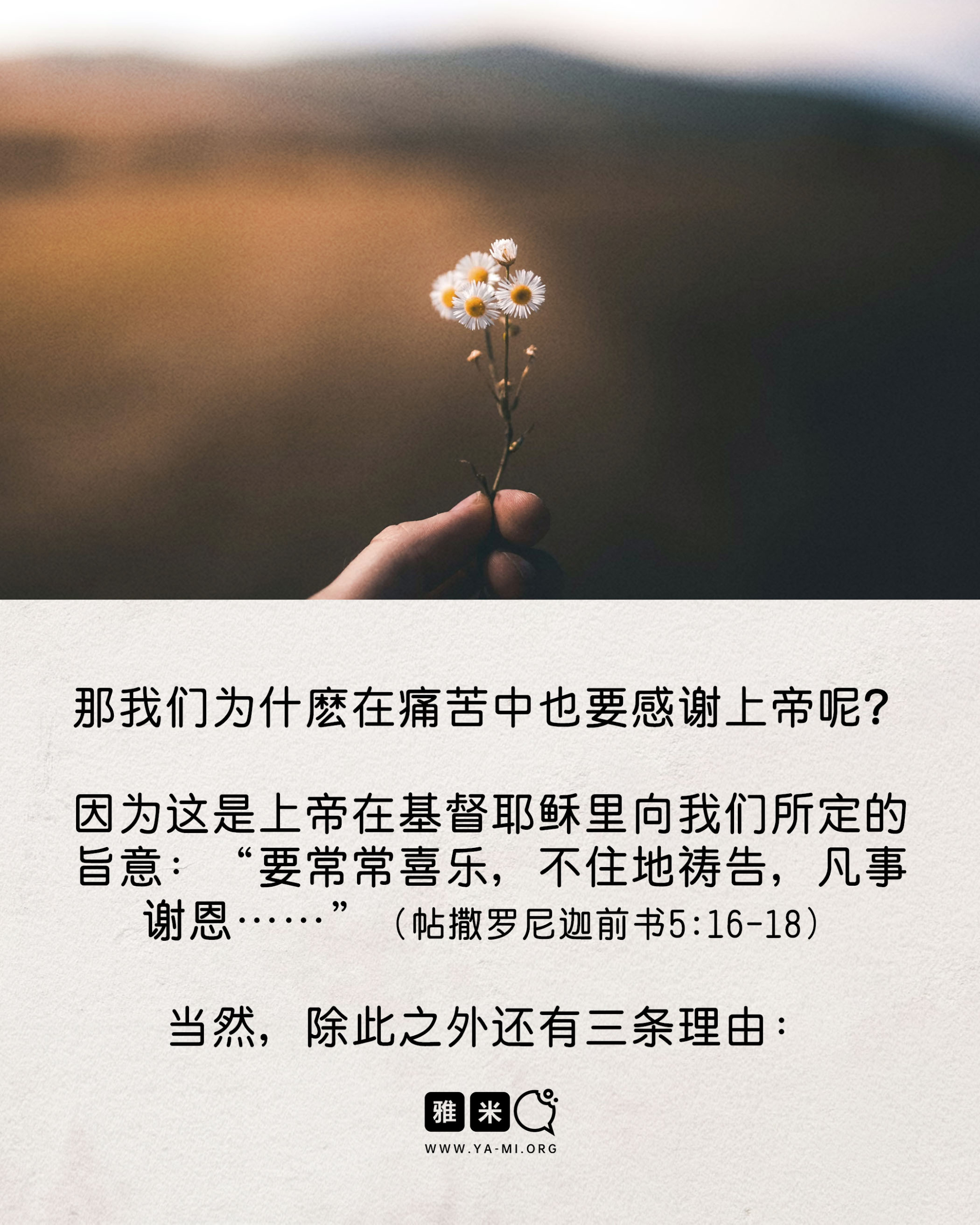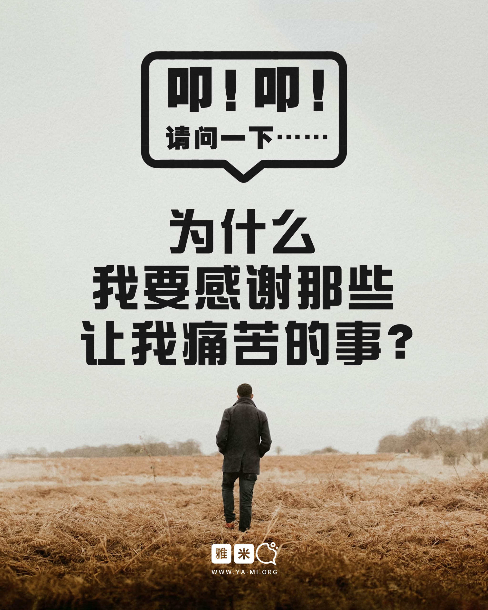 叩!叩!请问一下……为什么我要感谢那些让我痛苦的事?2025 年 11 月 25 日/0 评论/在: 信仰专栏, 其他, 系列特辑/通过: 雅米 基督徒经常被提醒要“凡事感恩”,即使是在逆境,在苦难中,也可以感恩。但是,为什么我要感谢那些让我痛苦的事? 有时候真的说不出“感谢神,让我遭遇这些磨难”,难道就说明我没有感恩的心吗? *此文章由雅米事工原创,如需转载,请注明出自“雅米,祢的话语so yummy!- www.ya-mi.org”分享此条目! https://ya-mi.org/sc/wp-content/uploads/2025/11/叩!叩!请问一下_11月_feature-Image_SC.jpg 630 1200 雅米 https://ya-mi.org/tc/wp-content/uploads/2025/05/%E6%96%B0logo.jpeg 雅米2025-11-25 07:01:242025-11-25 17:03:59叩!叩!请问一下……为什么我要感谢那些让我痛苦的事?