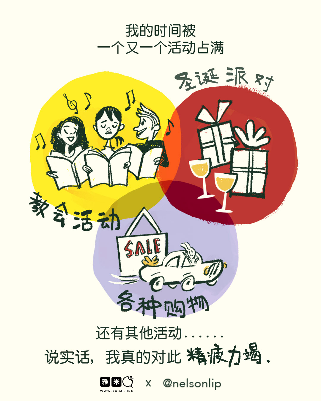 12月图文特辑:为什么圣诞季我总是这么累?2025 年 12 月 17 日/0 评论/在: 图文特辑, 艺术空间/通过: 雅米 作者:YMI X @nelsonlip圣诞节预示着会有众多的庆祝活动和各种社交互动。这应该挺令人期待的…..对吧?然而,圣诞季也意味着一段需要精心策划派对和各种教会活动的时期。这些准备工作很容易让我们感到疲惫。不知不觉中,我们已经筋疲力尽,甚至无法享受节日的乐趣。在这些似乎无休止的活动中,我们很容易就忘记了我们庆祝圣诞节的真正原因:耶稣。祂来了是为让我们在混乱的生命中拥有平安。祂是我们的和平之君(以赛亚书 9章6节)。请让耶稣成为你圣诞庆祝活动的焦点。 *此文章由雅米事工原创,如需转载,请注明出自“雅米,祢的话语so yummy!- www.ya-mi.org”分享此条目! https://ya-mi.org/sc/wp-content/uploads/2025/12/为什么圣诞季我总是这么累?_feature-Image.jpg 860 2048 雅米 https://ya-mi.org/tc/wp-content/uploads/2025/05/%E6%96%B0logo.jpeg 雅米2025-12-17 07:01:022025-12-16 22:48:3412月图文特辑:为什么圣诞季我总是这么累?