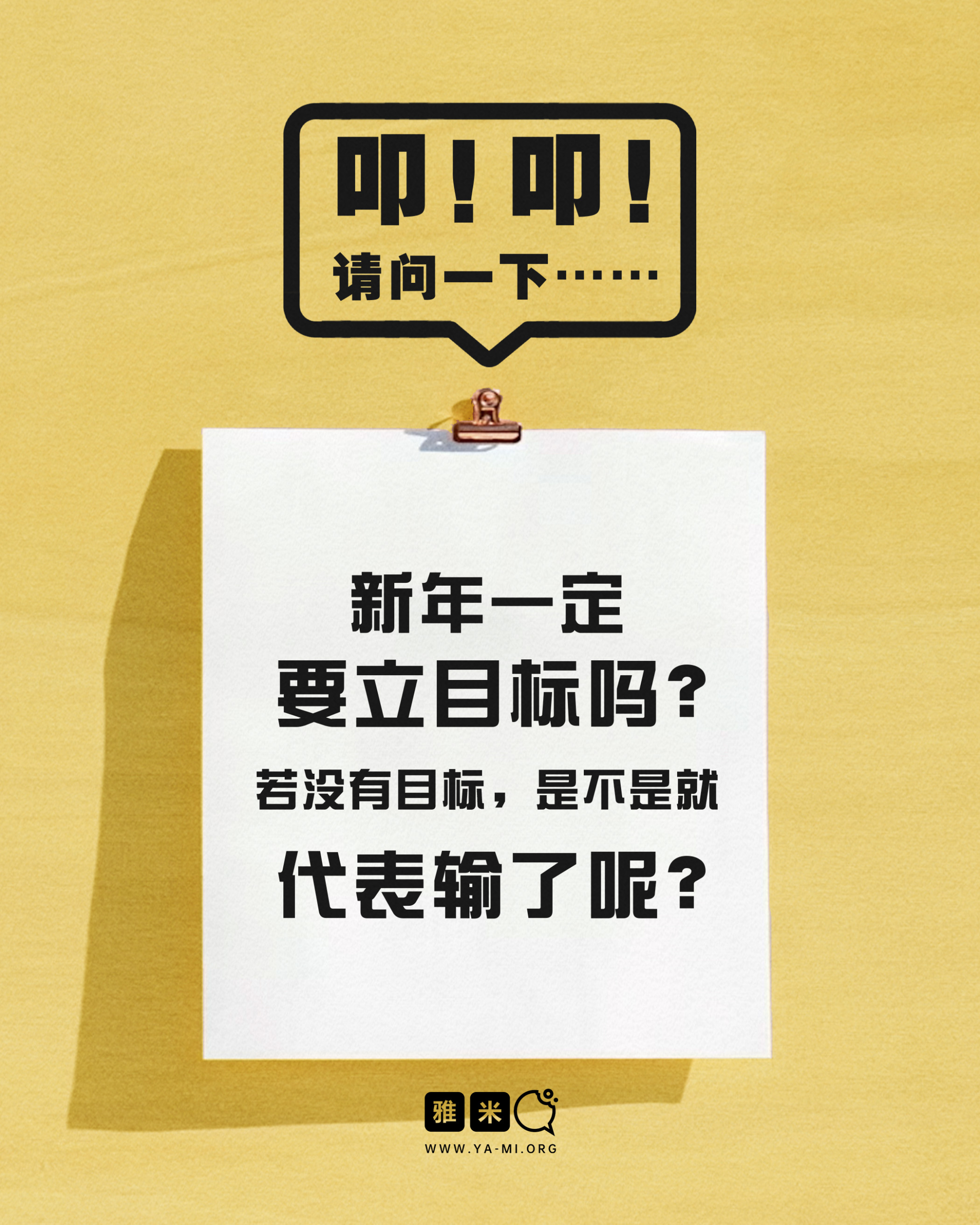 叩!叩!请问一下……新年一定要立目标吗?若没有目标,是不是就代表输了呢?2026 年 01 月 29 日/0 评论/在: 探索自我, 认识我/通过: 雅米 新的一年开始,作为一年的展望,我们总是被提醒要订立目标,让这一年有规划地度过。但是不知道从什么时候开始,新目标变成了随时都会倒的“flag”,很少有人能坚持1年,也许1个月也不到!于是慢慢的,也不想再立什么目标了。这难道就说明,我输了吗?今年就会荒废吗? *此文章由雅米事工原创,如需转载,请注明出自“雅米,祢的话语so yummy!- www.ya-mi.org”分享此条目! https://ya-mi.org/sc/wp-content/uploads/2026/01/叩!叩!请问一下_1月_feature-Image_SC.jpg 630 1200 雅米 https://ya-mi.org/tc/wp-content/uploads/2025/05/%E6%96%B0logo.jpeg 雅米2026-01-29 07:01:462026-01-28 23:32:56叩!叩!请问一下……新年一定要立目标吗?若没有目标,是不是就代表输了呢?