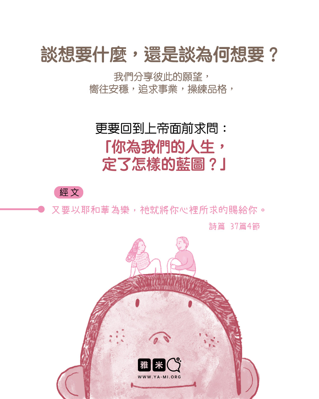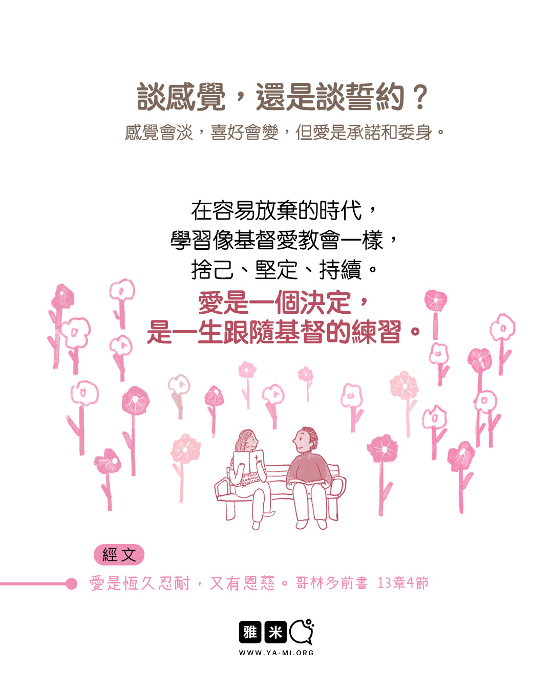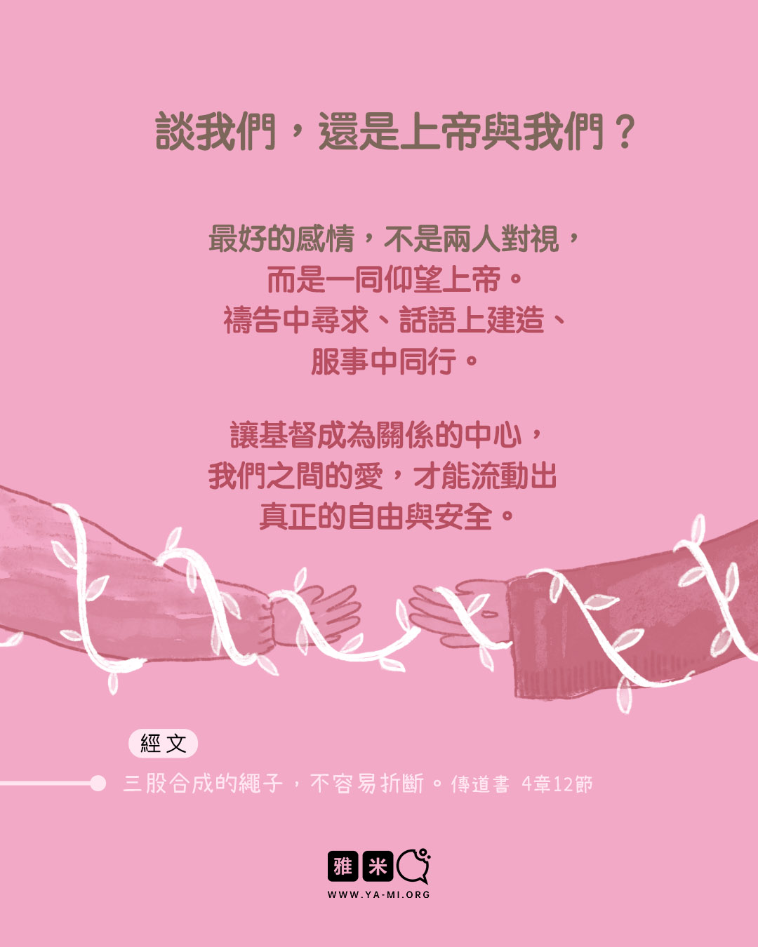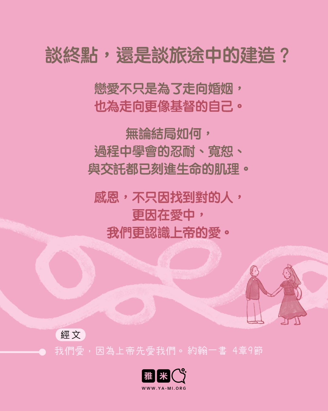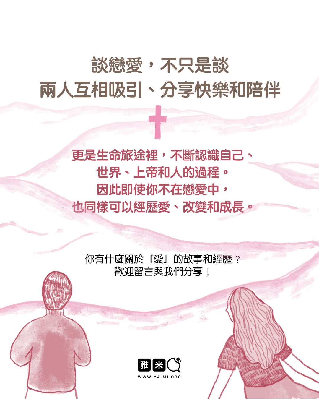 2 月圖文特輯:談戀愛,到底在談什麼?2026 年 02 月 11 日/0 評論/在: 圖文特輯, 婚戀, 藝術空間/通過: 雅米 繪畫:Eve談戀愛,到底在談什麼? 你是否想過,為什麼戀愛非「談」不可? 又是該「談」些什麼,才能彼此舒服、造就、滿足, 在這段互相專屬對方的關係中健康成長? 有的人談戀愛,不用「談」,肢體接觸很多,最終卻難以「談明白」。 有的人談著談著,彷彿毫無意義,毫無造就的營養。 這一期圖文讓我們一起深入思考「談戀愛」這回事! *此文章由雅米事工原創,如需轉載,請註明出自“雅米,祢的話語so yummy!-www.ya-mi.org”分享此條目! https://ya-mi.org/tc/wp-content/uploads/2026/02/ap_2026021_TC.jpg 1350 1080 雅米 https://ya-mi.org/tc/wp-content/uploads/2025/05/%E6%96%B0logo.jpeg 雅米2026-02-11 07:01:072026-02-10 22:11:172 月圖文特輯:談戀愛,到底在談什麼?