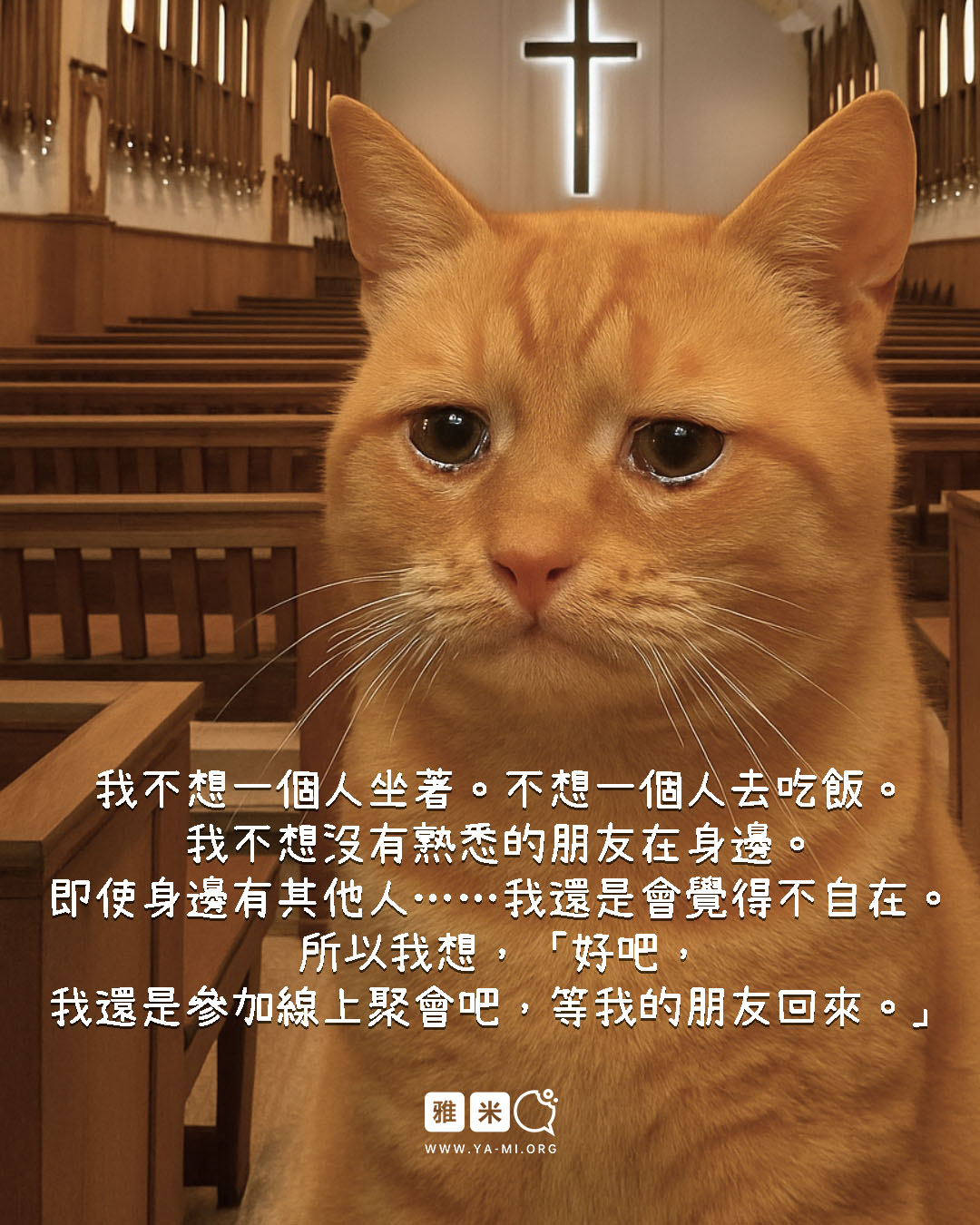 事實上……有時我們不得不承認內心的答案是「不想去」,並不是因為我們不愛上帝,而是因為我們「不想孤單」。我們不想獨自一人茫然地坐在教會裡,不想禮拜結束後獨自一人去吃飯,不想覺得沒有自己的圈子在身邊。即便教會裡有別人,如果不是熟悉的朋友,我們也會感到不太自在。