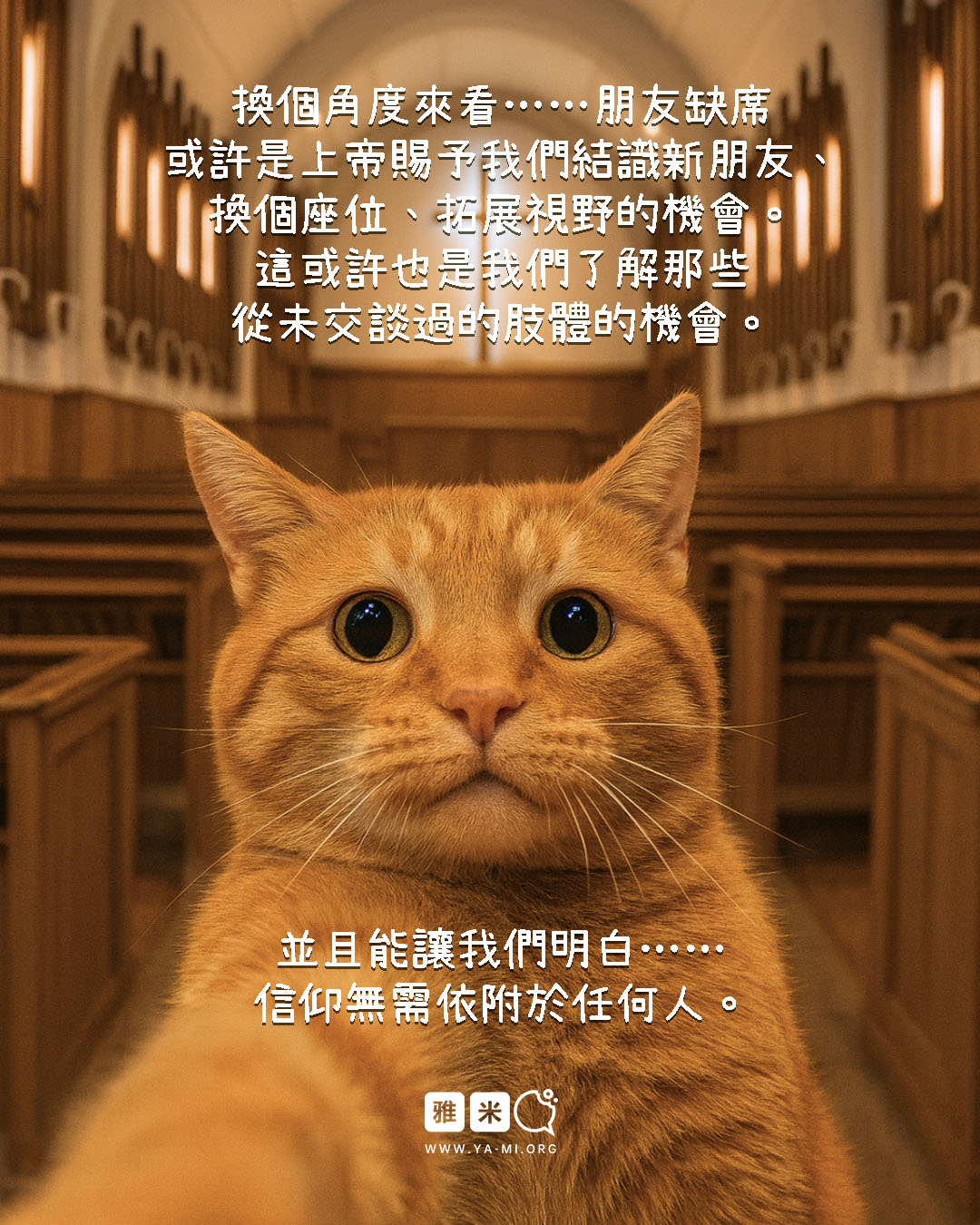 但如果我們退後一步,換個更廣的角度看,有時朋友不去可能反而是我們的機會。那可能是上帝帶我們去認識新朋友的日子,促使我們從固定座位走出來,有一個新的視角,或讓我們有機會了解那些在教會裡從未交談過的肢體。當我們敞開心扉,就會開始看見:我們的信仰不必依附於任何人,而是只與上帝緊密相連。
