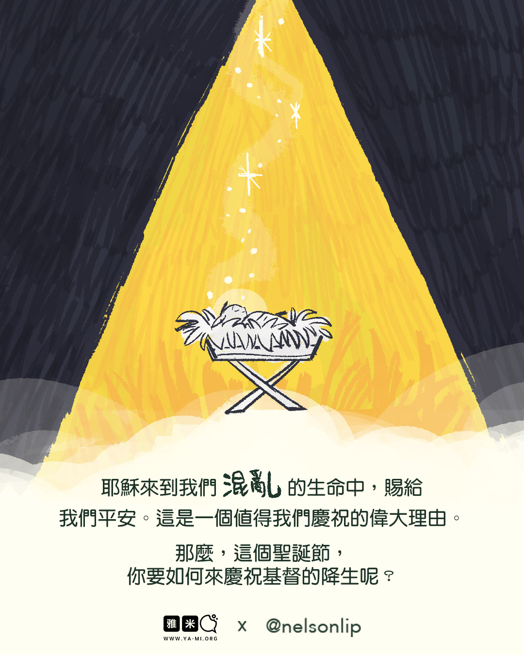 祂來了是為讓我們在混亂的生命中擁有平安。祂是我們的和平之君(以賽亞書 9章6節)。請讓耶穌成為你聖誕慶祝活動的焦點。